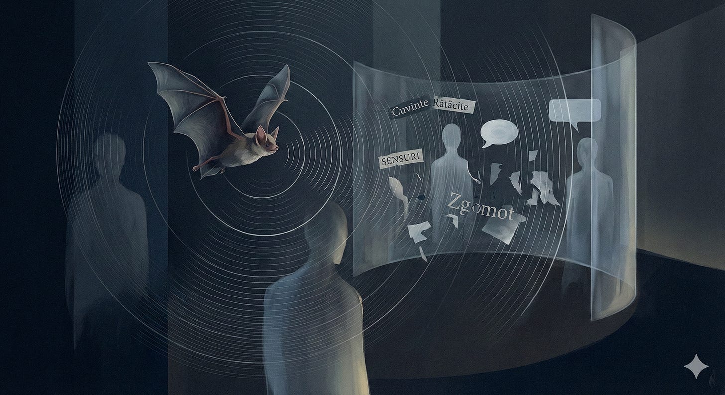 M-am oprit la pasajul ăsta pentru că mi-am dat seama că facem ceva similar în spațiile sociale. Nu identic - n-avem ecolocație biologică - dar metaforic, procesul seamănă. Emiți o idee într-un grup de părinți, într-o discuție politică, pe un thread de Substack, și ecoul îți spune totul. Nu neapărat despre idee, ci despre spațiul în care te afli. Despre ce poți spune și ce nu. Despre cine ascultă și cum reacționează.